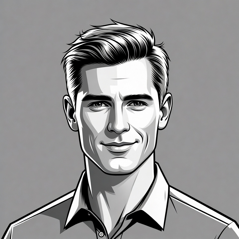 White, black and white, collared shirt, digital illustration, handsome man, headshot, isolated background, line art, male portrait, portrait, short hair, side parted hair, smiling man, vector art, young man, man