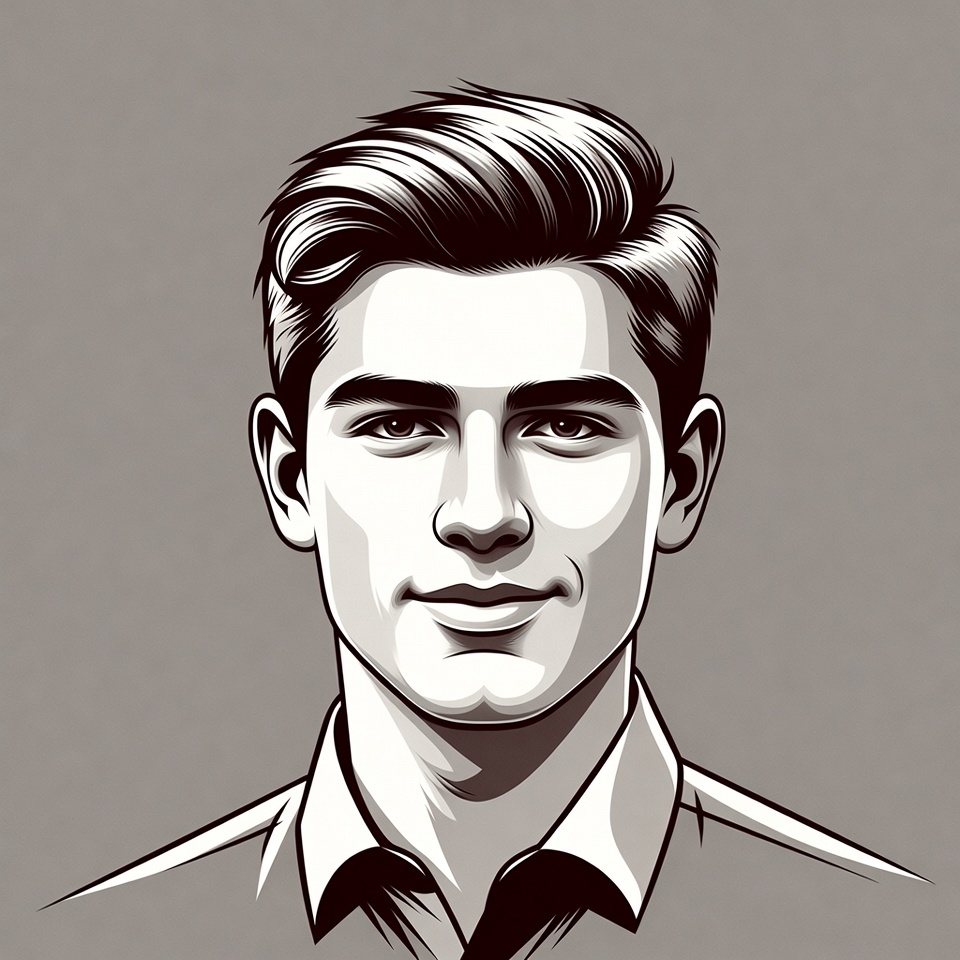 A digital illustration of a young man with neatly combed side-parted hair and a subtle smile. He wears a collared dress shirt and faces forward against a plain gray background. The black and white line art style emphasizes sharp facial features and clean lines.