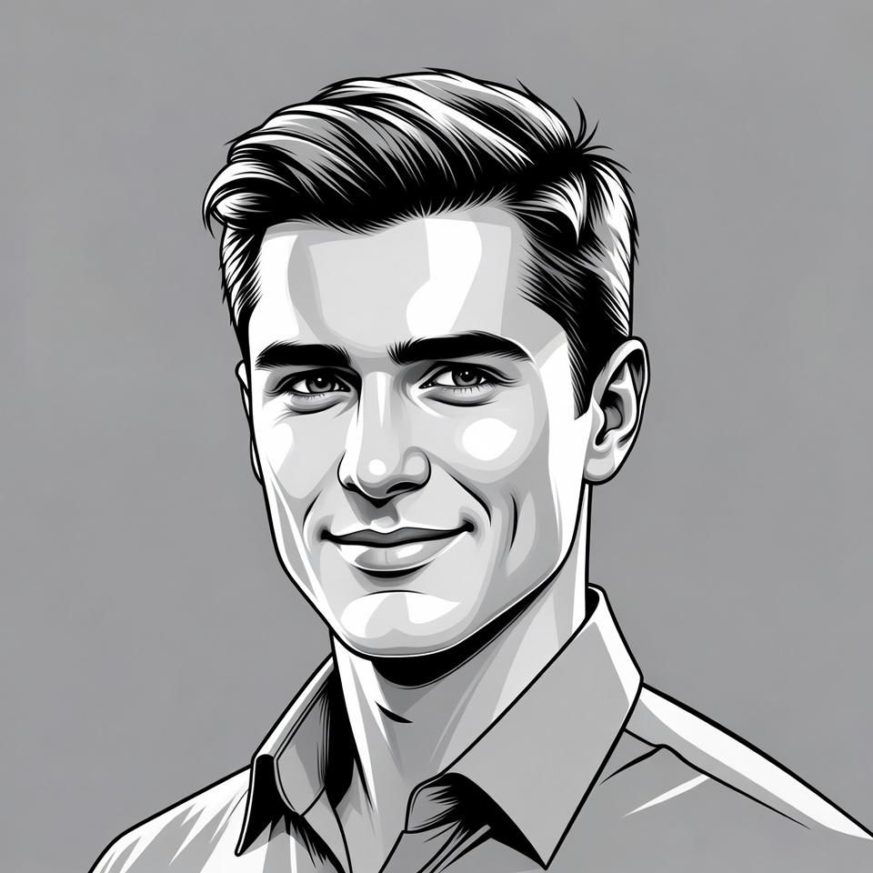White, collared shirt, confident expression, grayscale, handsome, headshot, illustration, line art, male, portrait, professional, short hair, side part, smiling, vector art, young man, man