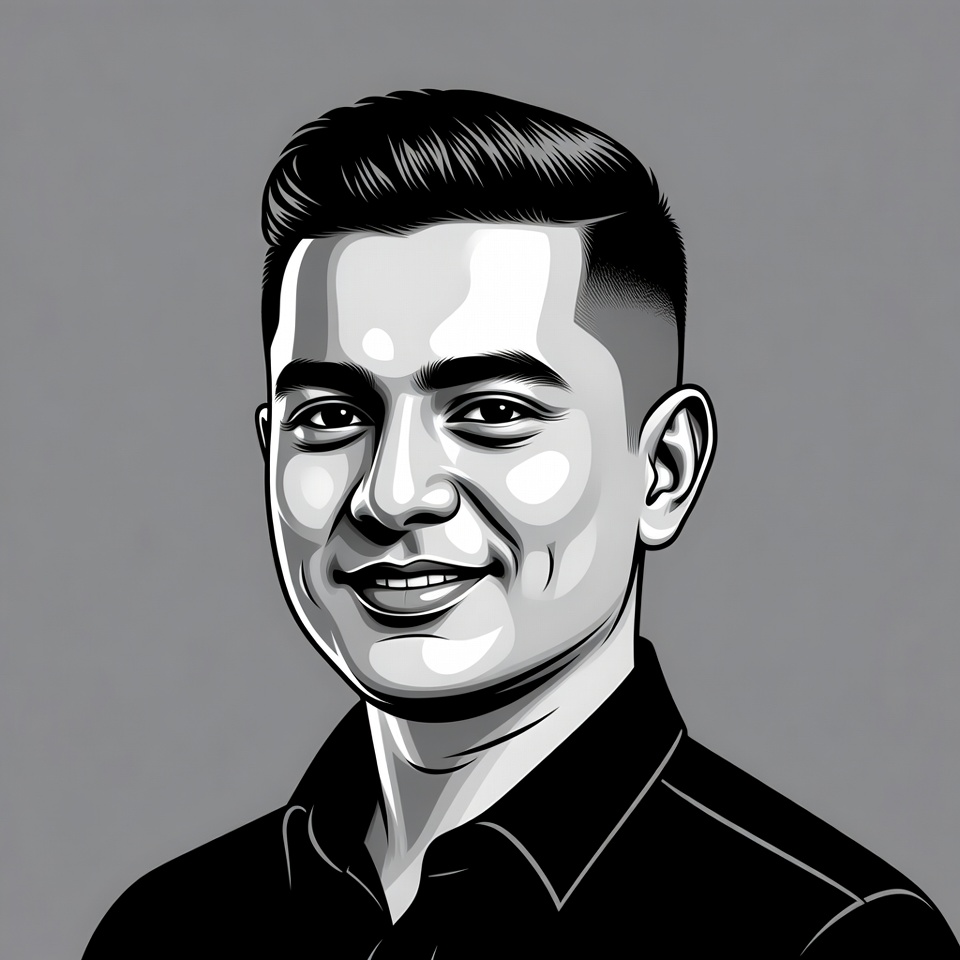 A black and white illustration of a young Asian man with short slicked-back hair and a friendly smile. He wears a collared shirt and is depicted in a detailed vector art style against a plain gray background. The portrait highlights his sharp facial features and confident expression.