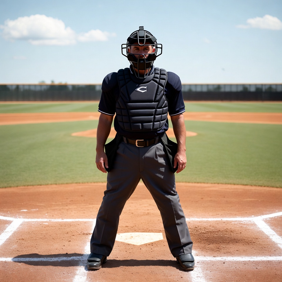 A male baseball catcher stands ready on the field wearing black protective gear including a mask, chest protector, and shin guards. He has his hands at his sides near his equipment belt, positioned behind home plate on a sunny day with a clear blue sky and green outfield. The baseball diamond and chain-link fence are visible in the background.