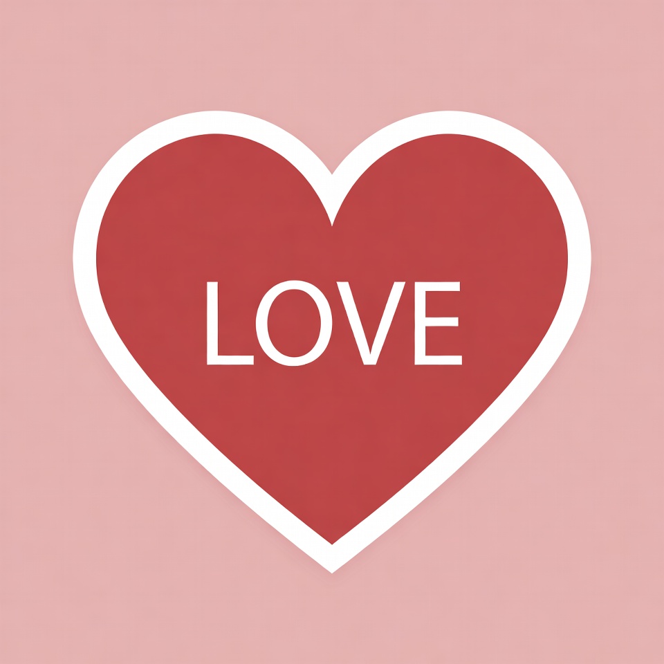 A bold red heart outline with white border sits on a soft pink background. The word 'LOVE' is centered inside the heart in large white capital letters with a red outline. The design is simple and graphic.