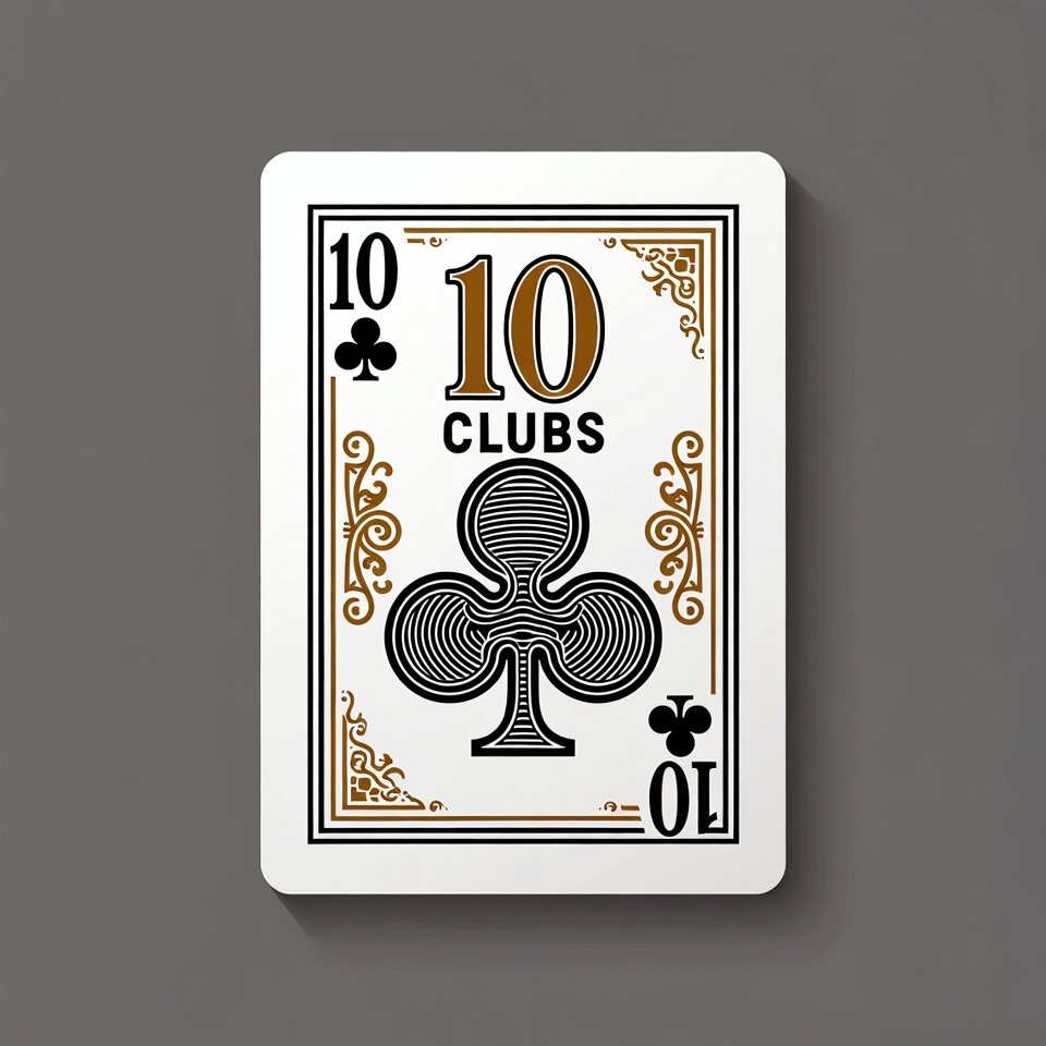 A white playing card with ornate gold borders displays the ten of clubs. Black club symbols are arranged in a central cluster with three prominent ones, flanked by the number '10' in corners. The word 'CLUBS' is written below the central design on a gray background.
