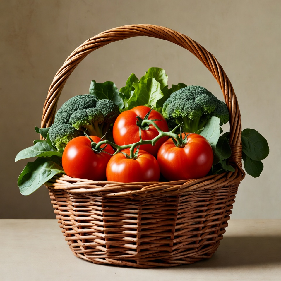 A wooden woven basket holds fresh red tomatoes and green broccoli florets. Leafy greens surround the vegetables, adding vibrant color. The basket sits on a neutral surface against a beige background.