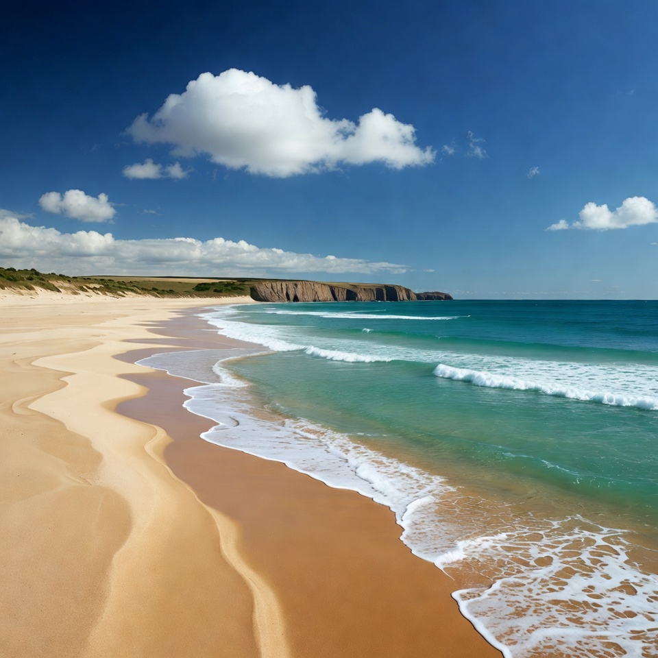 beachfront, blue sky, clear sky, cliffs, coast, coastal cliffs, coastline, dramatic cliffs, golden sand, horizon, landscape, nature, ocean, ocean view, sandy beach, scenic beach, sea, seascape, shoreline, sunny day, surf, tide, turquoise water, waves, white clouds, beach