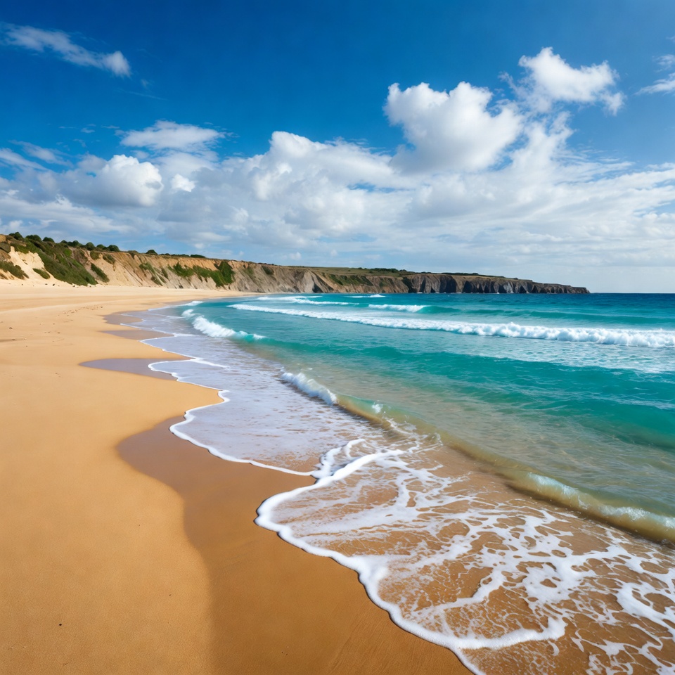 beachfront, blue sky, clear water, cliffs, coast, golden sand, landscape, nature, ocean waves, oceanfront, sand dunes, sandy beach, scenery, sea, seaside, shoreline, summer, sunny day, surf, tide, turquoise water, vacation, waves crashing, white clouds, white foam, beach