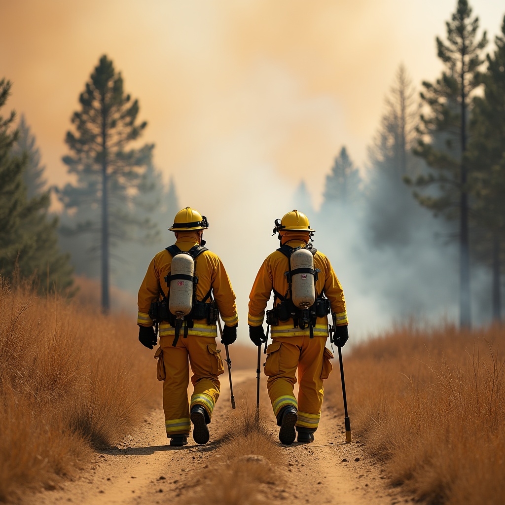 Two Firefighters Walking in Wildfire Forest