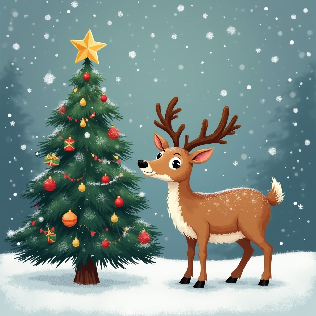 A cute illustrated reindeer with large antlers stands on snowy ground, gazing at a decorated Christmas tree. The tree features a golden star topper, colorful ornaments, and golden bells. Snowflakes fall around them on a blue winter background.