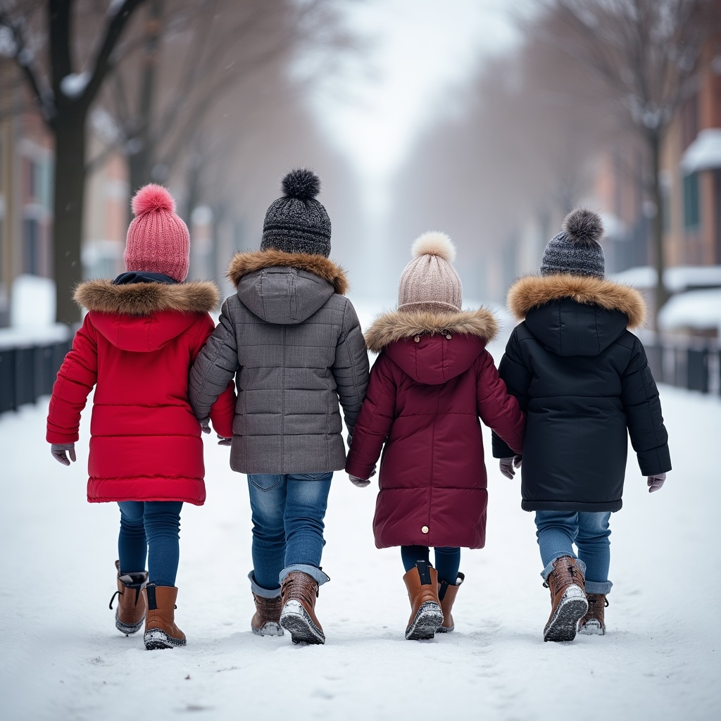 Four young girls in colorful puffer jackets and knitted beanies walk hand-in-hand down a snowy tree-lined path. They wear boots and jeans, viewed from behind against a backdrop of snow-covered trees and buildings. Snow dusts the ground as they stroll together.