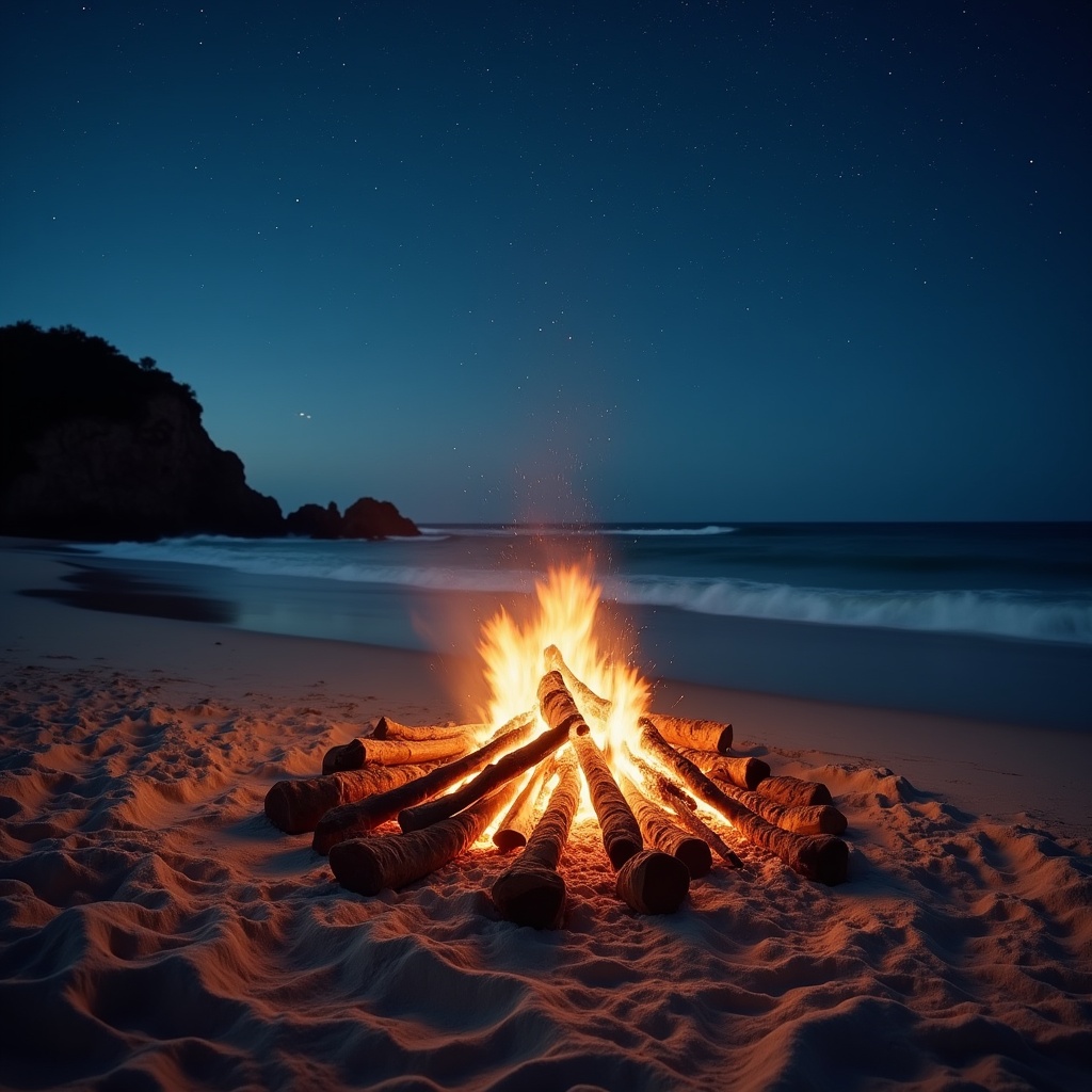 A vibrant bonfire burns brightly on a sandy beach under a starry night sky. Gentle waves crash nearby with rocky cliffs in the background. The fire's flames illuminate the surrounding sand and logs.