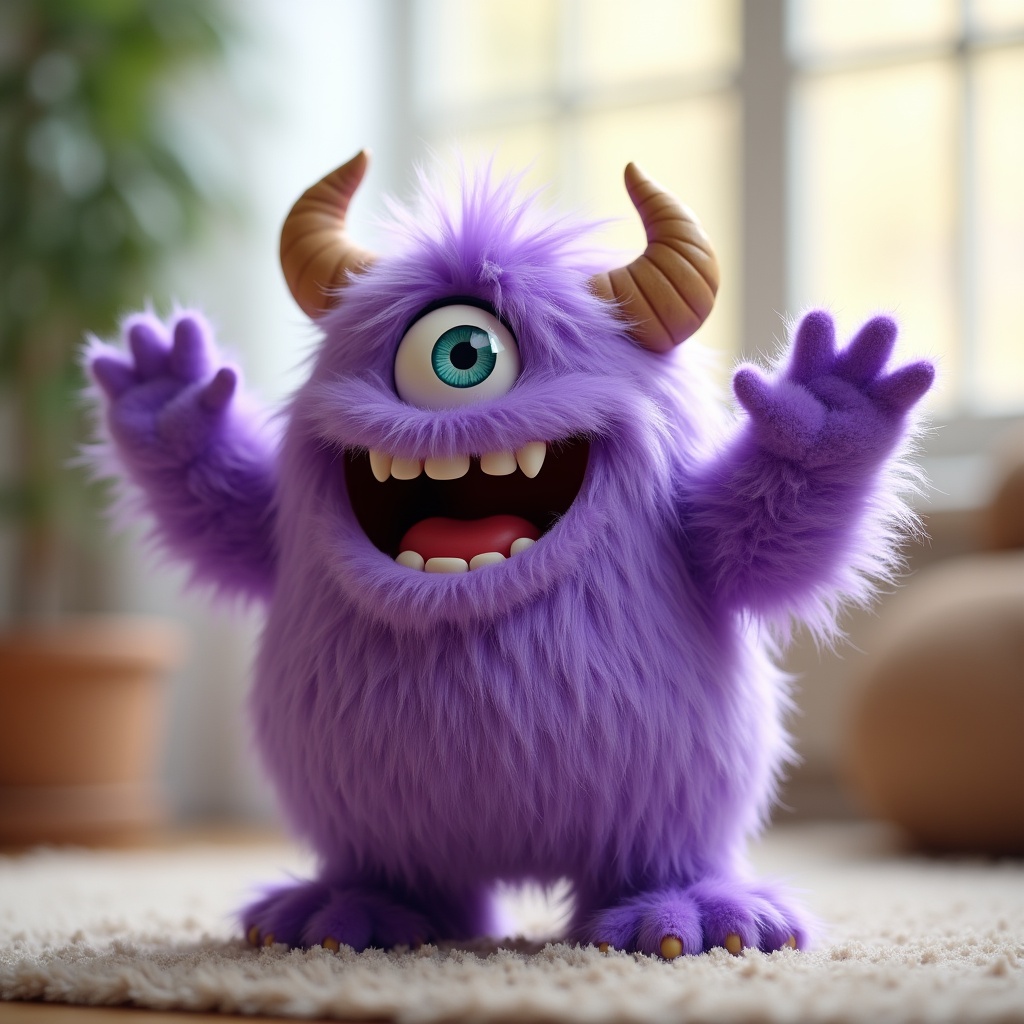 A cute purple furry monster with two horns and one large blue eye stands on a carpeted floor. It has an open mouth with a big smile and raises its purple paws excitedly. The scene includes a window with plants and a beige sofa in the background.
