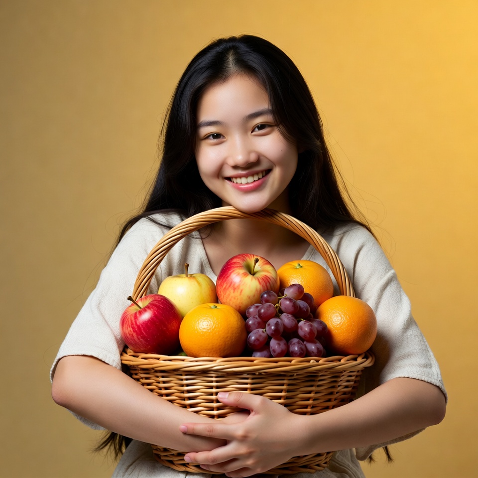 A young Asian woman with long black hair smiles while holding a woven basket filled with fresh fruits. The basket contains red apples, green apples, oranges, and grapes. She wears a light beige top against a yellow background.