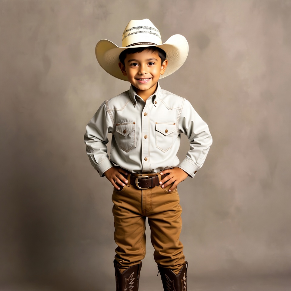 A young Latino boy stands confidently with hands on hips, wearing a large white cowboy hat with braided trim. He is dressed in a light gray button-up shirt, brown pants, and brown cowboy boots against a neutral beige background. His smiling face shows dimples and dark eyes.