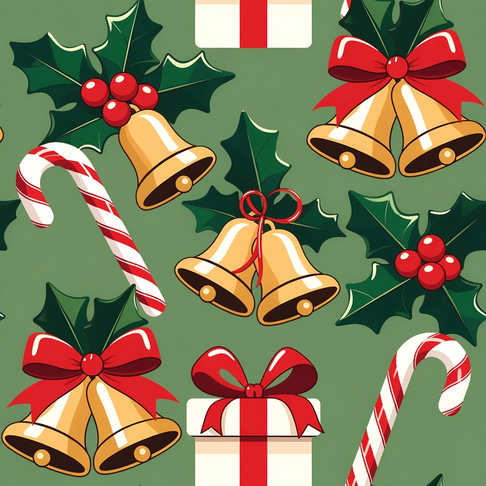 Christmas clipart, Christmas decorations, bells, candy canes, festive design, gift box, golden bells, green background, holiday clipart, holly, holly leaves, illustration, jingle bells, peppermint sticks, red berries, red bow, red ribbon, seamless pattern, wrapped gift, Christmas pattern