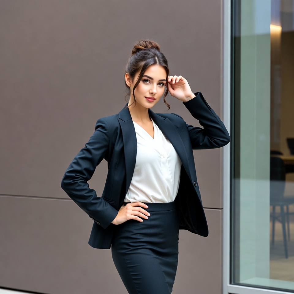 A young woman with dark hair in a bun wears a navy blue blazer, white blouse, and matching skirt. She stands confidently with hands on hips in front of a modern glass building with a gray wall. Her expression is poised as she glances to the side.