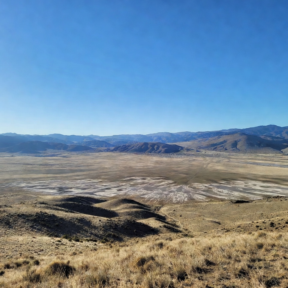 A wide desert valley stretches out under a clear blue sky, featuring dry tan terrain and patches of white salt flats. Layered brown mountains rise in the background. Sparse dry grass covers the foreground hillside.