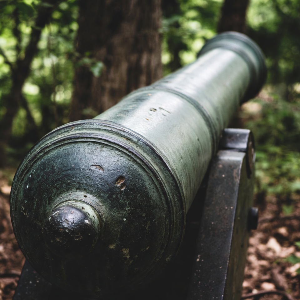 antique, artillery, barrel, carriage, foliage, forest, green, gun, historical, isolated background, metal, military, moss, nature, outdoor, patina, trees, vintage, weapon, woods, cannon