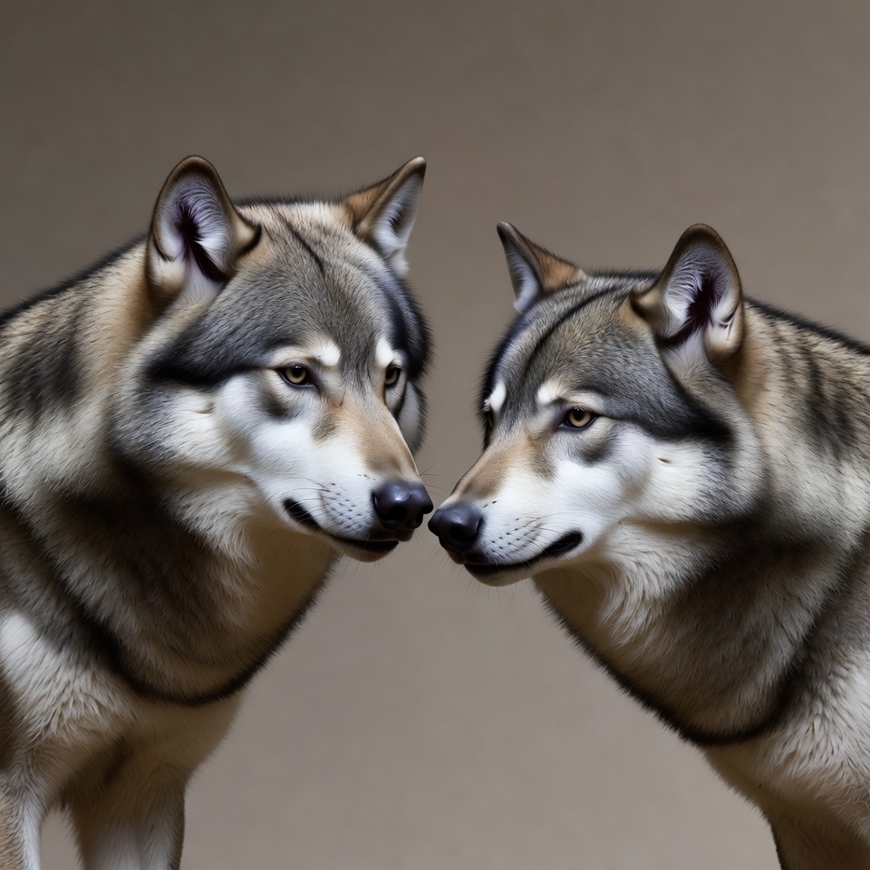 Two gray wolves with light brown faces stand close together on a beige background. Their noses are gently touching as they face each other. The wolves have erect ears and detailed fur in shades of gray and tan.