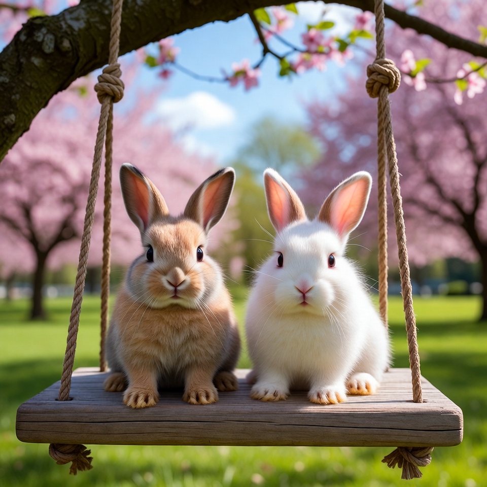 Two adorable bunnies, one brown and one white, sit side by side on a wooden swing hanging from ropes. They are surrounded by blooming pink cherry blossom branches under a clear blue sky. Lush green grass and trees form the background.
