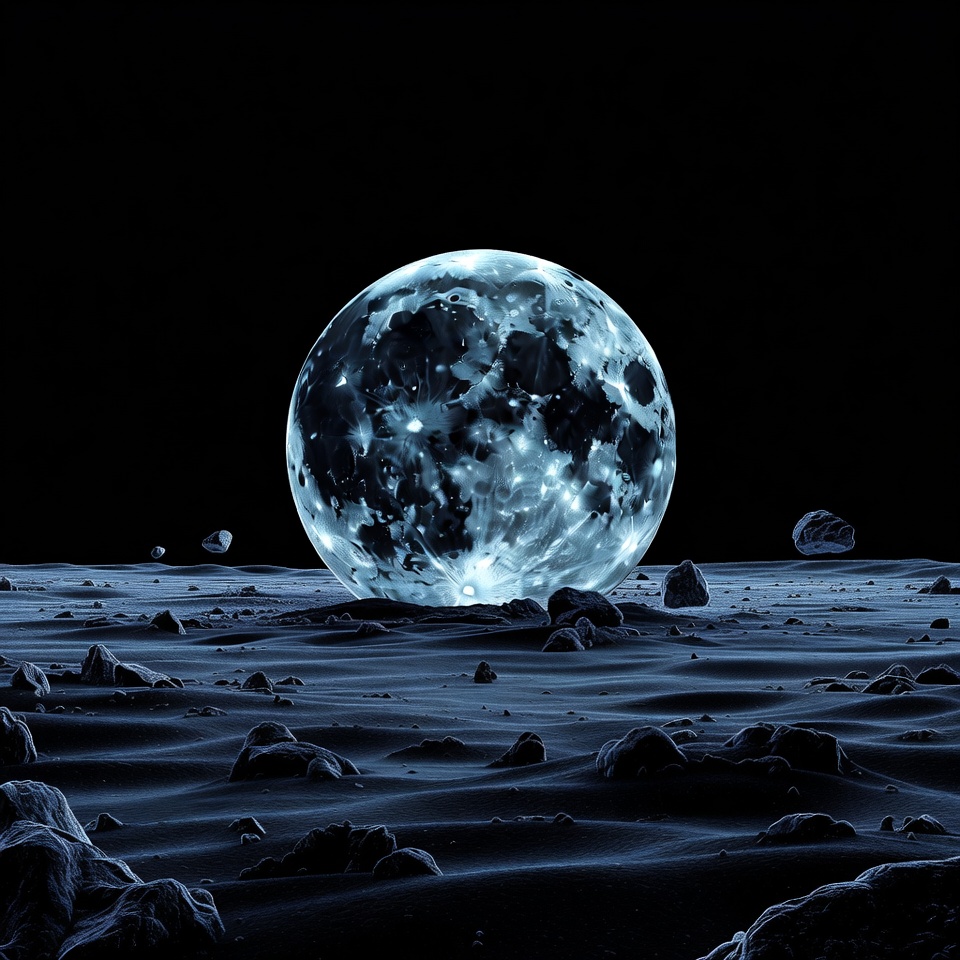 blue glow, cosmic scene, craters, dark space, debris, digital art, extraterrestrial, floating rocks, full moon, glowing moon, illuminated moon, lunar surface, night sky, planetary body, rocks, rocky surface, sci-fi moon, space landscape, starry background, moon
