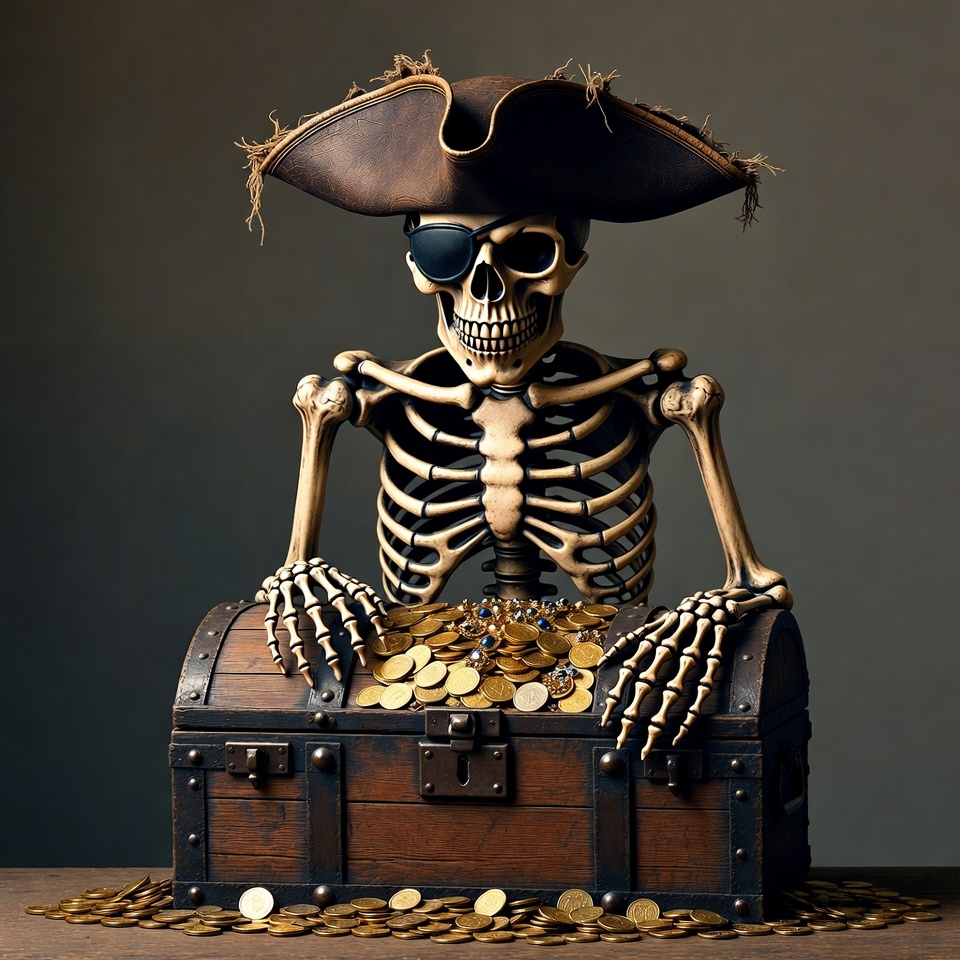 A pirate skeleton wearing a tattered tricorn hat and eyepatch sits holding a wooden treasure chest overflowing with gold coins. Its bony hands grasp the coins, with more spilling onto a dark surface below. The figure is posed against a plain gray background.