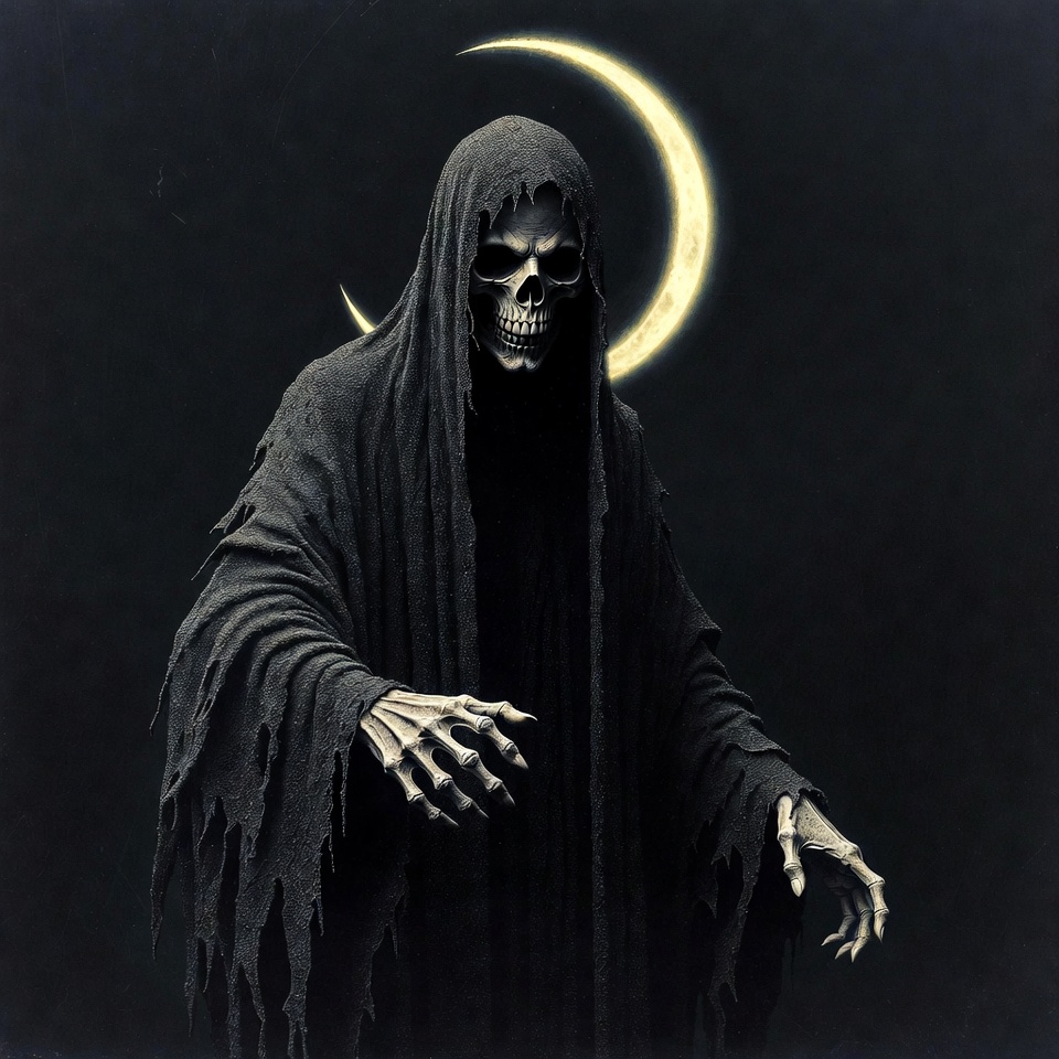 A skeletal Grim Reaper in a tattered black hooded cloak stands with arms outstretched against a dark background. A glowing yellow crescent moon shines behind its skull head. Bony hands emerge from the ragged sleeves.