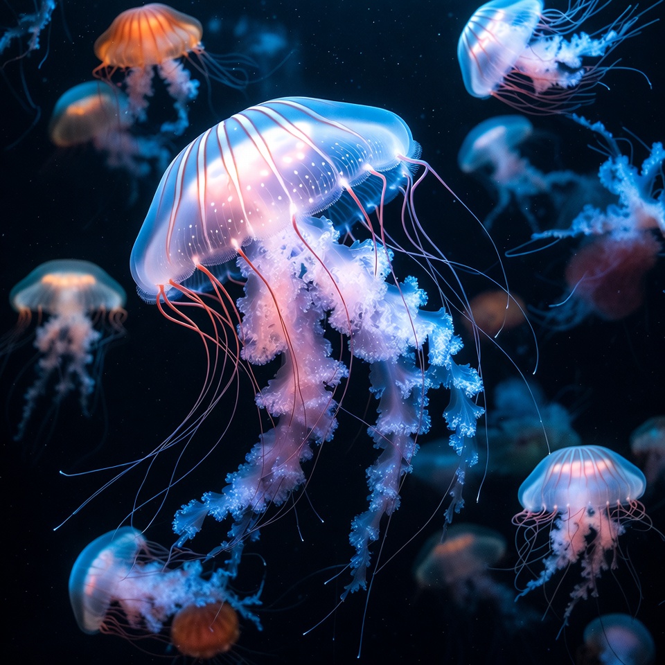 bioluminescent, blue jellyfish, colorful jellyfish, dark background, floating jellyfish, glowing, marine life, ocean, orange jellyfish, pink jellyfish, sea creatures, tentacles, translucent, underwater, jellyfish