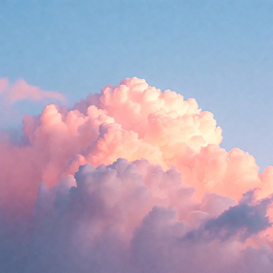 Fluffy clouds in shades of pink and white dominate the sky against a pastel blue background. The clouds form large, billowing shapes with soft edges. The scene captures a serene sky during sunset or sunrise.