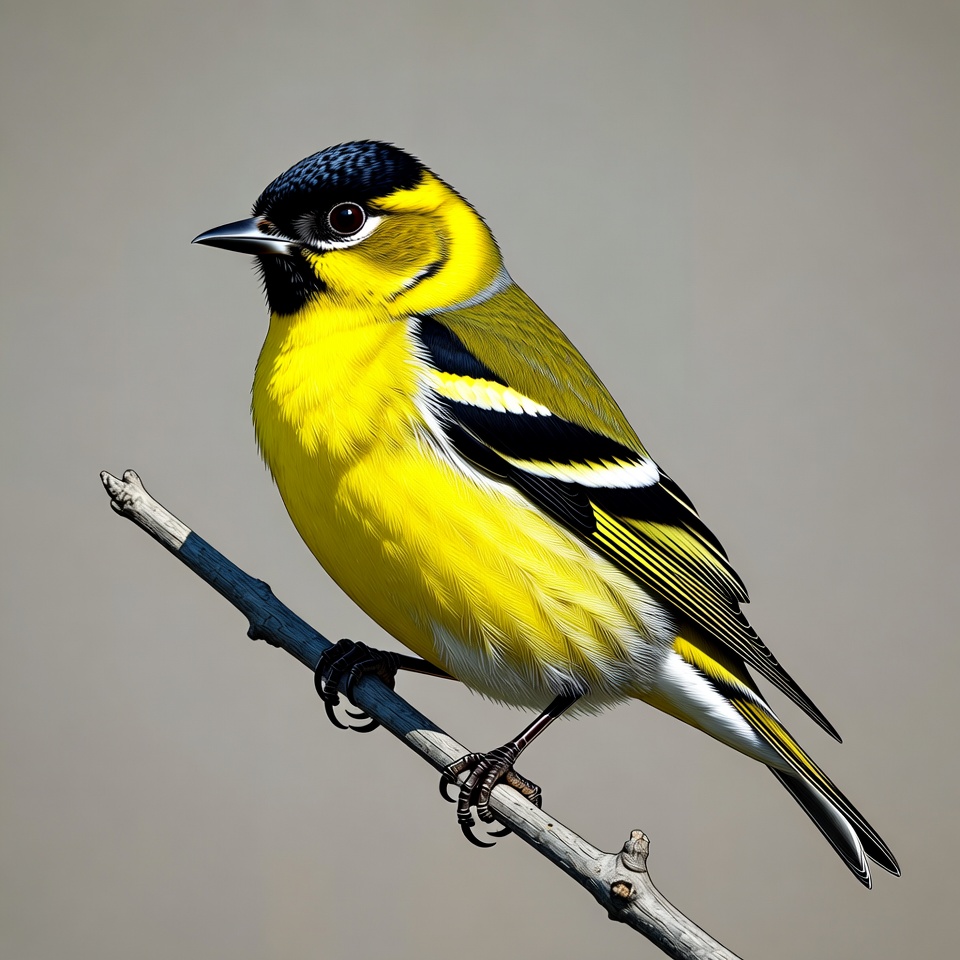 A vibrant yellow warbler with black and white markings perches on a thin branch. The bird features a black cap, yellow face with eye stripes, and fluffy feathers. It stands against a plain gray background.
