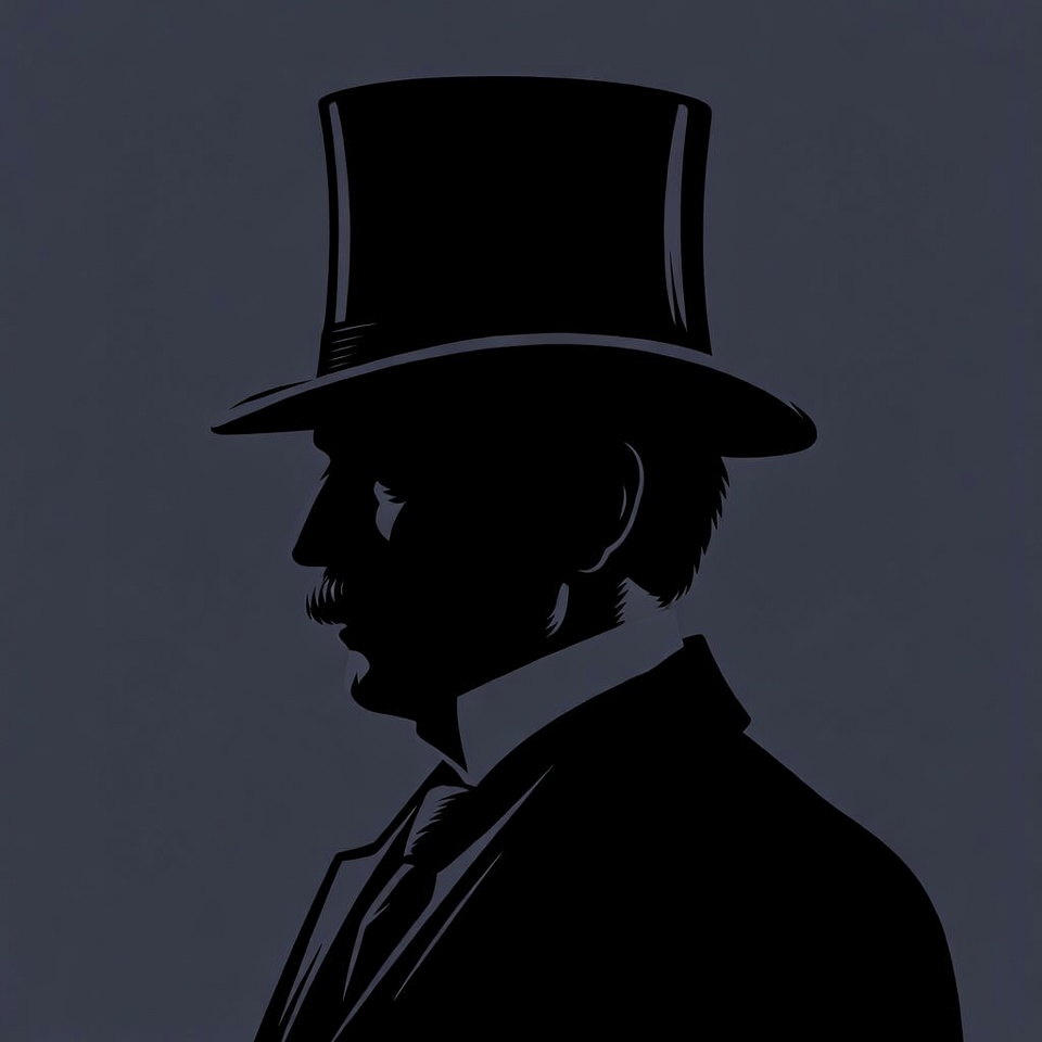 A black silhouette illustration of a man in profile view wearing a tall top hat, suit, and mustache. He stands against a dark gray background with fine white outlines defining his formal attire and facial features.