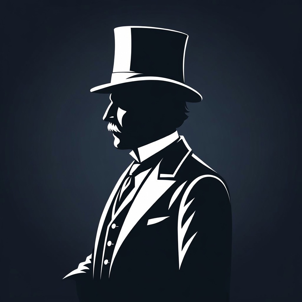 A black silhouette illustration of a Victorian-era man in profile view against a dark navy background. He wears a tall top hat, formal suit with vest and tie, and a prominent mustache. His pose is elegant with one hand in his pocket.