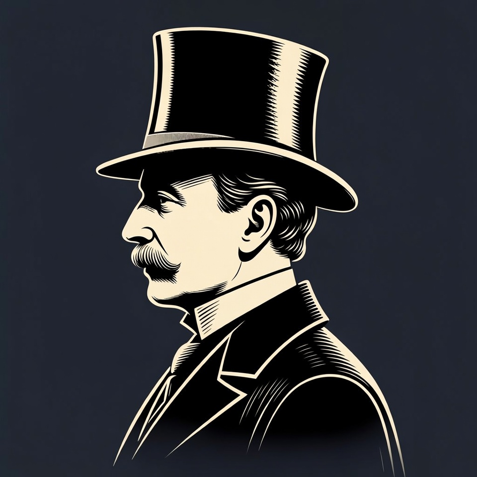 A detailed line art illustration depicts a Victorian-era gentleman in profile view. He wears a tall black top hat, a formal suit with high collar, and a prominent mustache. The artwork uses black and white ink on a dark background.