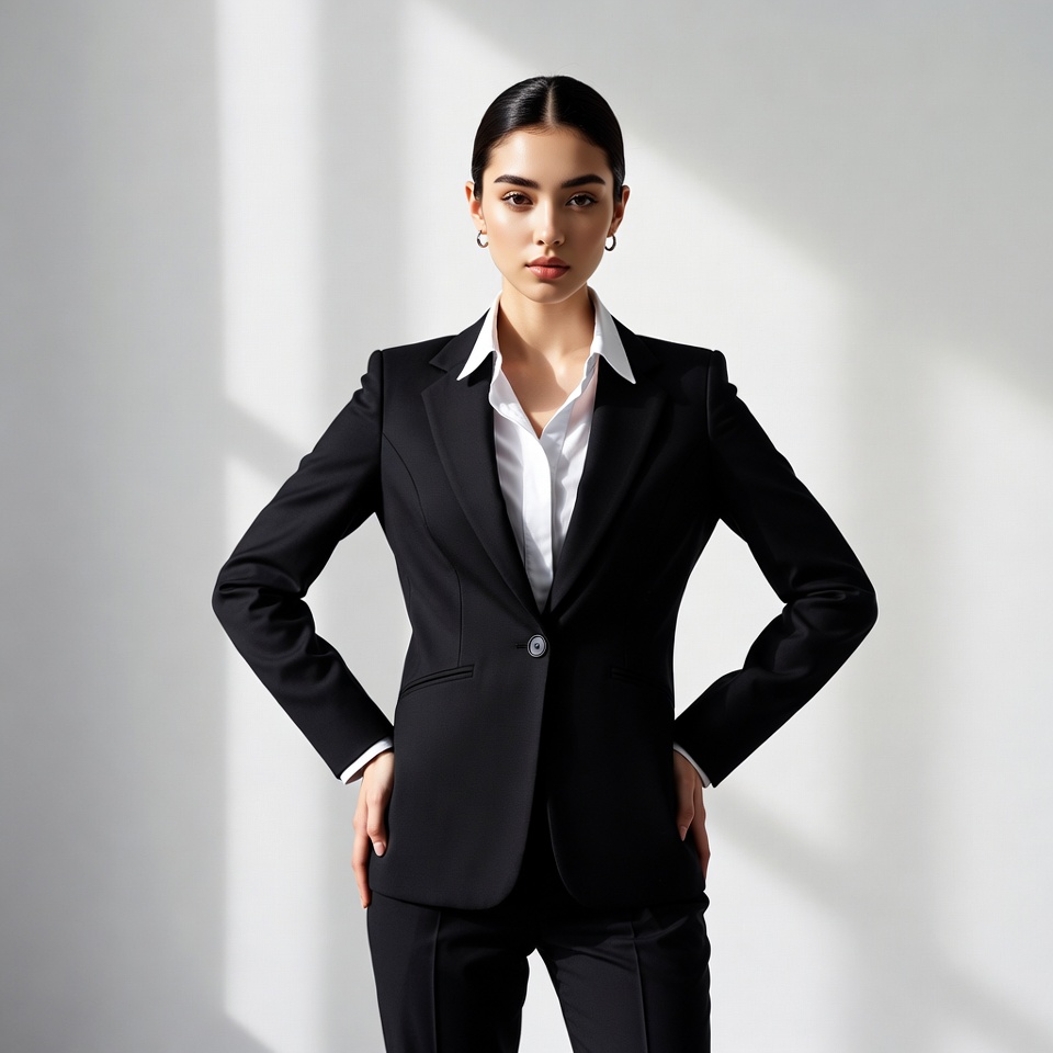 A young Asian woman with dark hair in a bun stands confidently with hands on hips. She wears a tailored black blazer suit over a white collared shirt. Natural light streams from the side against a plain white background.