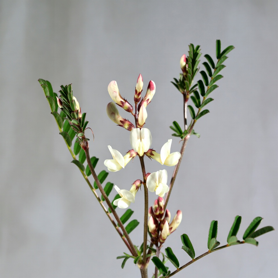 A cluster of white sweet clover flowers with pink-tipped buds blooms on green pinnate leaves. The plant is isolated against a plain gray background. Delicate white petals and reddish stems create a natural botanical display.