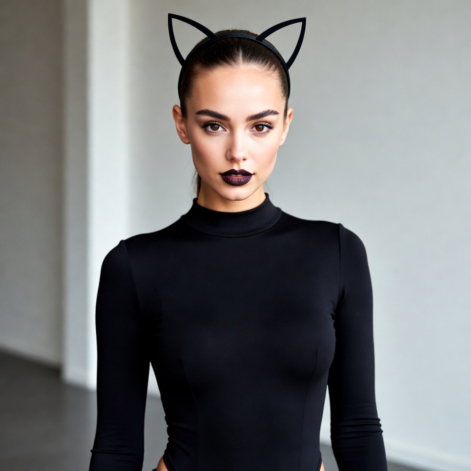 Halloween costume, black outfit, bodysuit, cat ears, cat ears costume, confident pose, dark hair, dark lipstick, fashion, female, headband, indoor, long hair, makeup, ponytail, portrait, sexy woman, striking eyes, turtleneck, white wall, young woman, woman