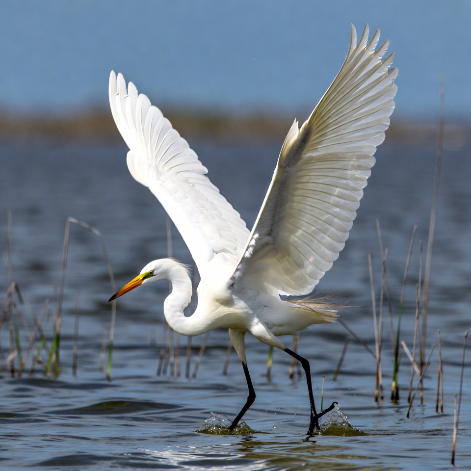 aquatic bird, bird, bird photography, black legs, blue sky, feathers, flying bird, great egret, marsh, nature, orange beak, reeds, shallow water, wading bird, water, white egret, wildlife, wings spread, egret