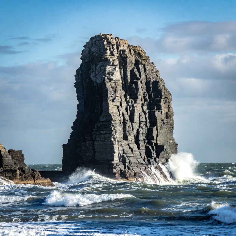 A tall, rugged sea stack rises dramatically from the ocean amid crashing waves. The rock formation features jagged cliffs under a partly cloudy sky. Surrounding rocks and turbulent sea water highlight the coastal scene.
