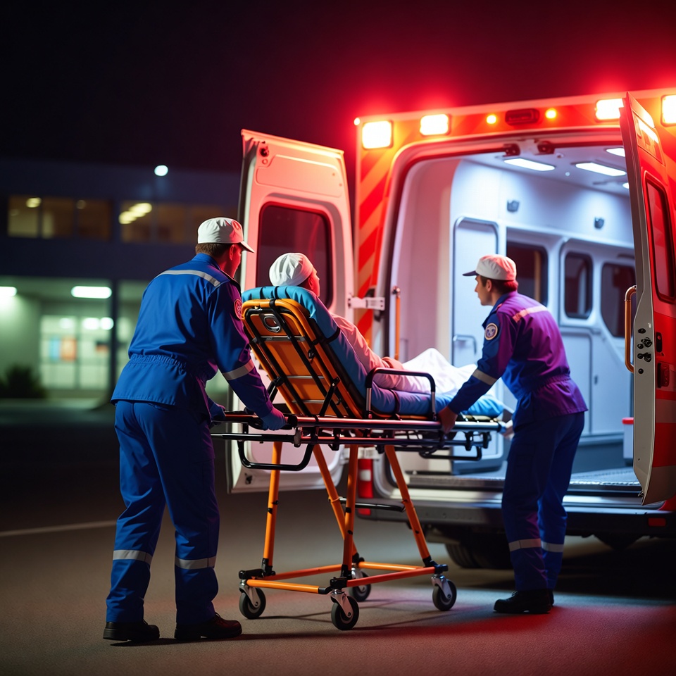 ambulance, blue uniforms, dark sky, emergency, emergency vehicle, emts, female patient, first responders, flashing lights, gurney, healthcare workers, hospital building, male paramedics, medical, medical transport, night, open doors, outdoor, patient, red lights, reflective gear, rescue, stretcher, urgent care, white helmets, yellow stripes, paramedics