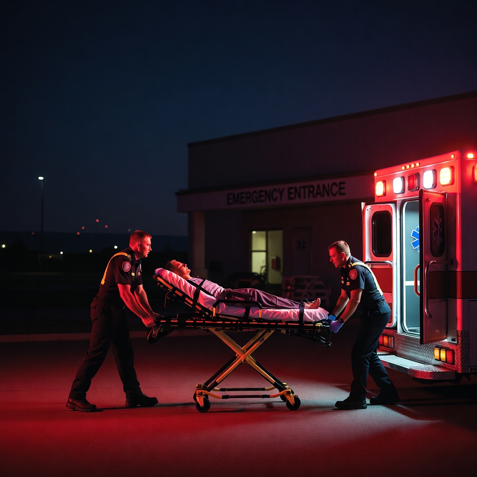 Two male paramedics in dark uniforms wheel a stretcher with a patient covered in a blanket toward an ambulance at night. The scene is lit by red emergency lights outside the hospital's emergency entrance. The patient lies supine on the yellow stretcher as the paramedics push it across the pavement.