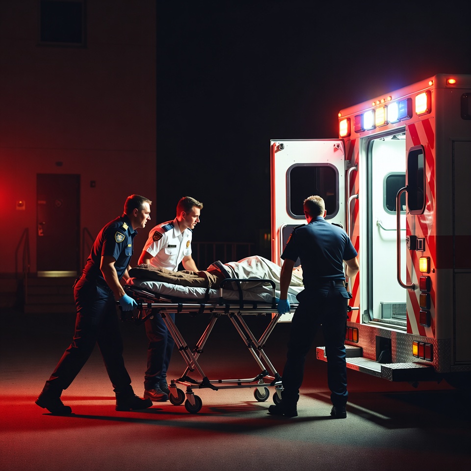 Three paramedics in uniforms carry a patient on a stretcher towards an open ambulance at night. The ambulance doors are open with red and blue emergency lights flashing. The scene is illuminated by the vehicle's lights against a dark background.