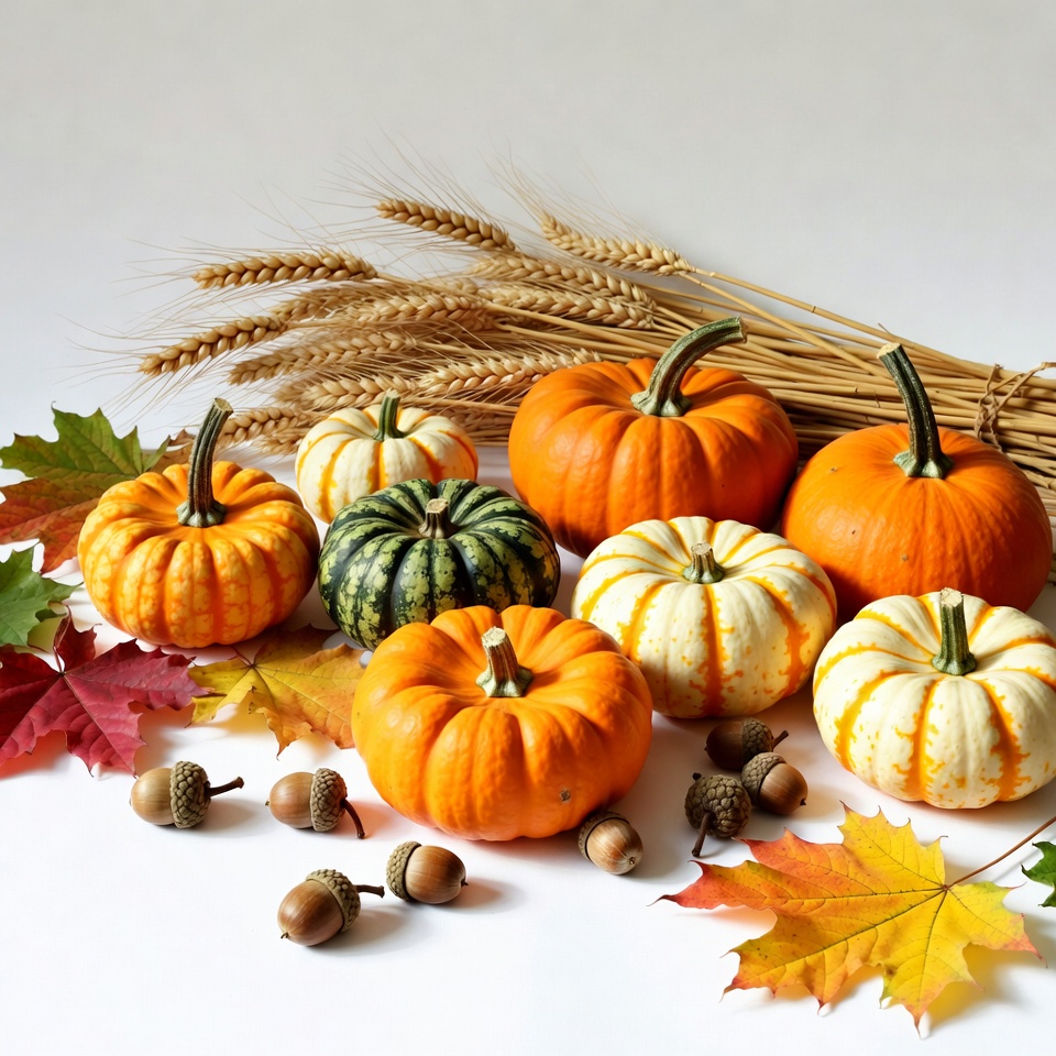 A variety of colorful pumpkins in orange, green, white, and striped patterns are arranged on a white background. Golden wheat stalks and red maple leaves are scattered around them. Acorns are also placed among the fall decorations.