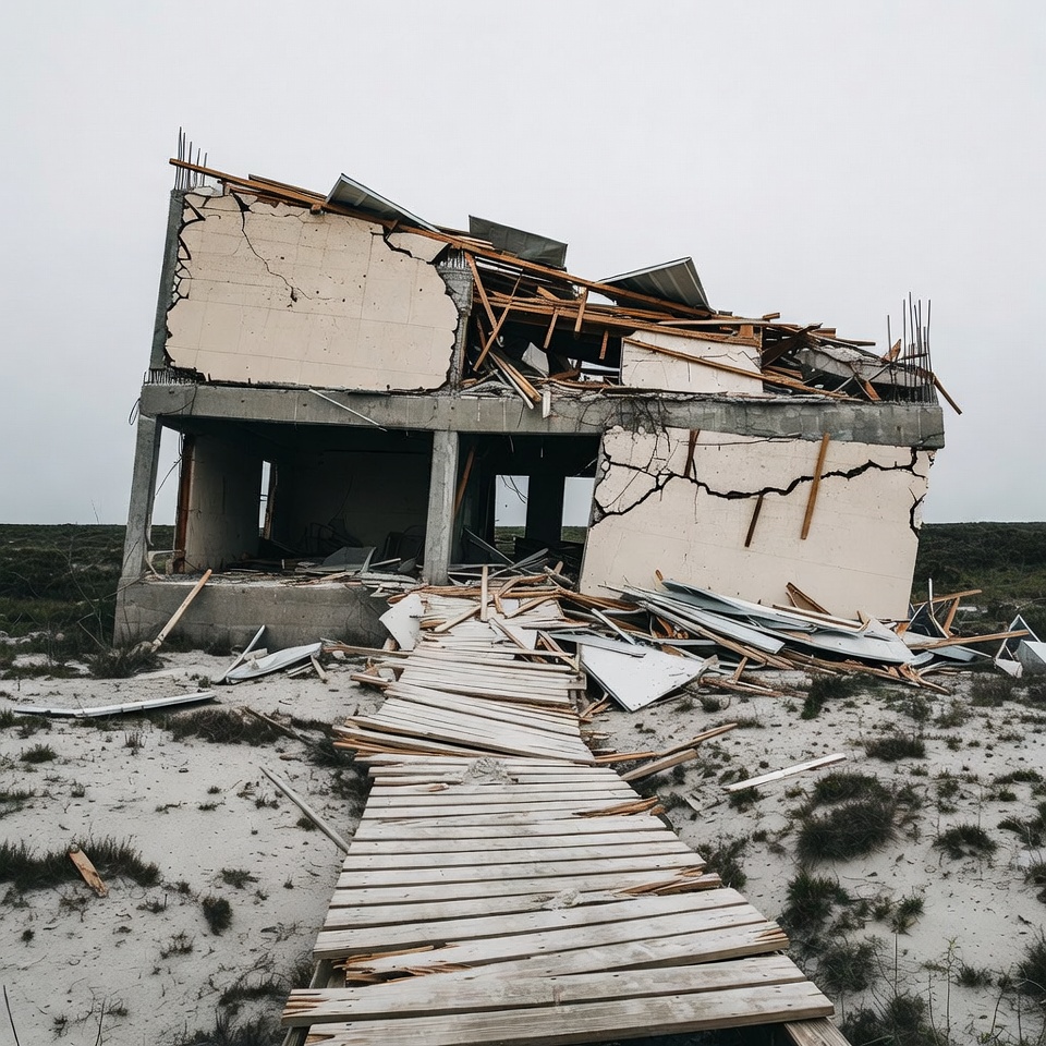 abandoned house, broken walkway, collapsed roof, concrete structure, construction failure, cracked walls, damaged building, debris, devastation, disaster aftermath, exposed beams, foggy sky, grass, gray concrete, hurricane damage, natural disaster, outdoor scene, rebar, ruined home, sandy ground, sheet metal, storm wreckage, white walls, wooden planks, wreckage, destroyed house