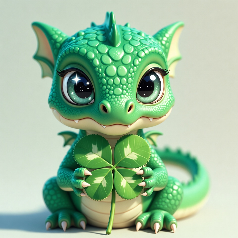 A chibi-style green baby dragon with large sparkling eyes holds a four-leaf clover in its tiny claws. The dragon features detailed textured scales, small wings, horns, and a playful smile. It sits on a plain background with shiny 3D rendering.