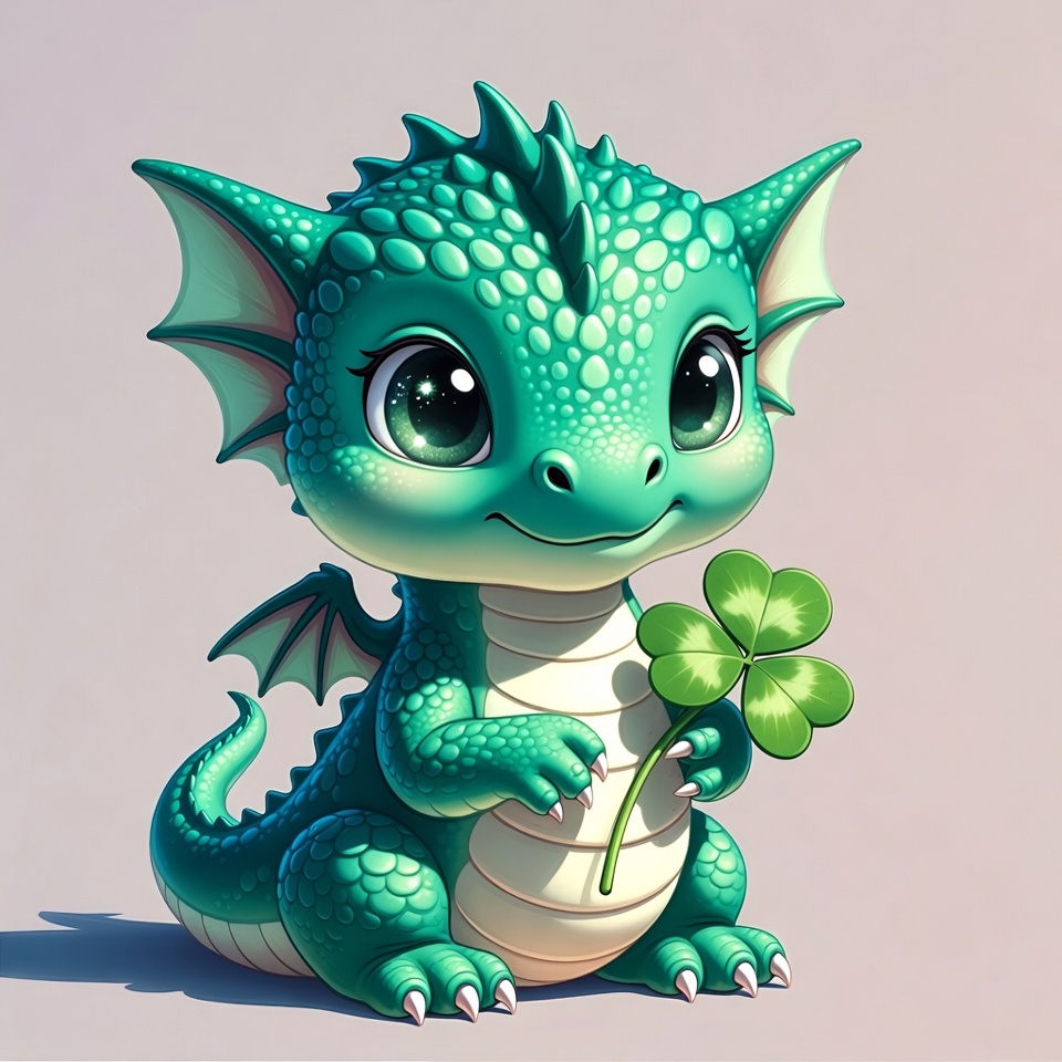 A cute green baby dragon with large sparkling eyes holds a four-leaf clover in its claws. It has shiny emerald scales, small wings, and a friendly smile. The illustration features a soft gradient background with gentle lighting.