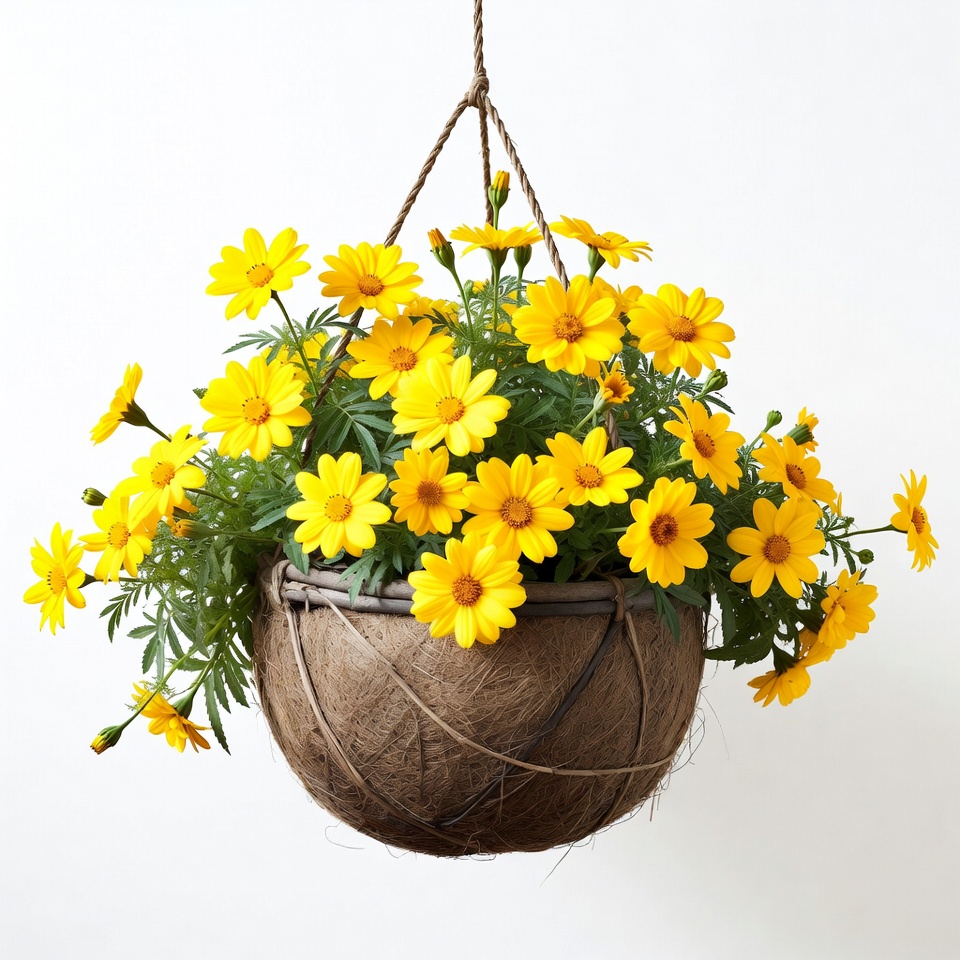 basket, blooming flowers, daisies, daisy flowers, floral, flower arrangement, foliage, garden plant, green leaves, hanging basket, isolated, plant, rope, suspended, white background, woven basket, yellow daisies, yellow petals, yellow flowers