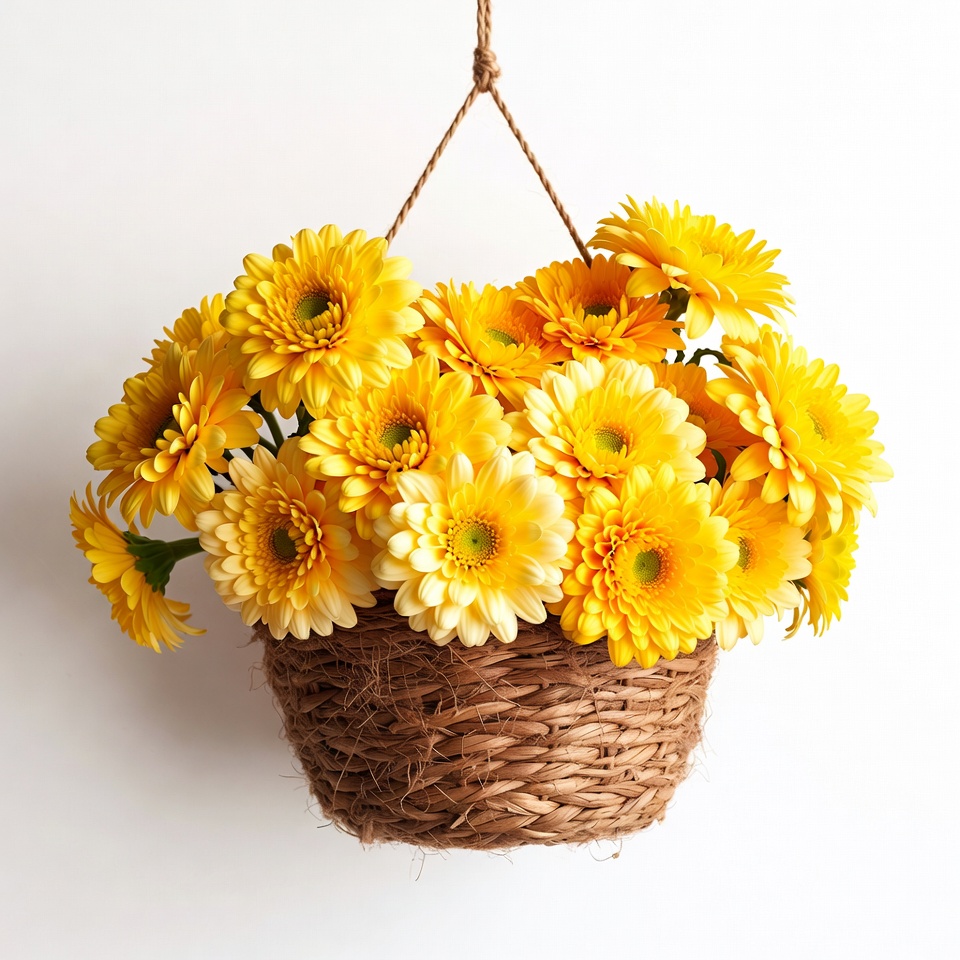 A woven hanging basket overflows with vibrant yellow gerbera daisies. The flowers feature bright petals and green centers, suspended by a rope against a white background. The arrangement is dense and full, isolated for display.