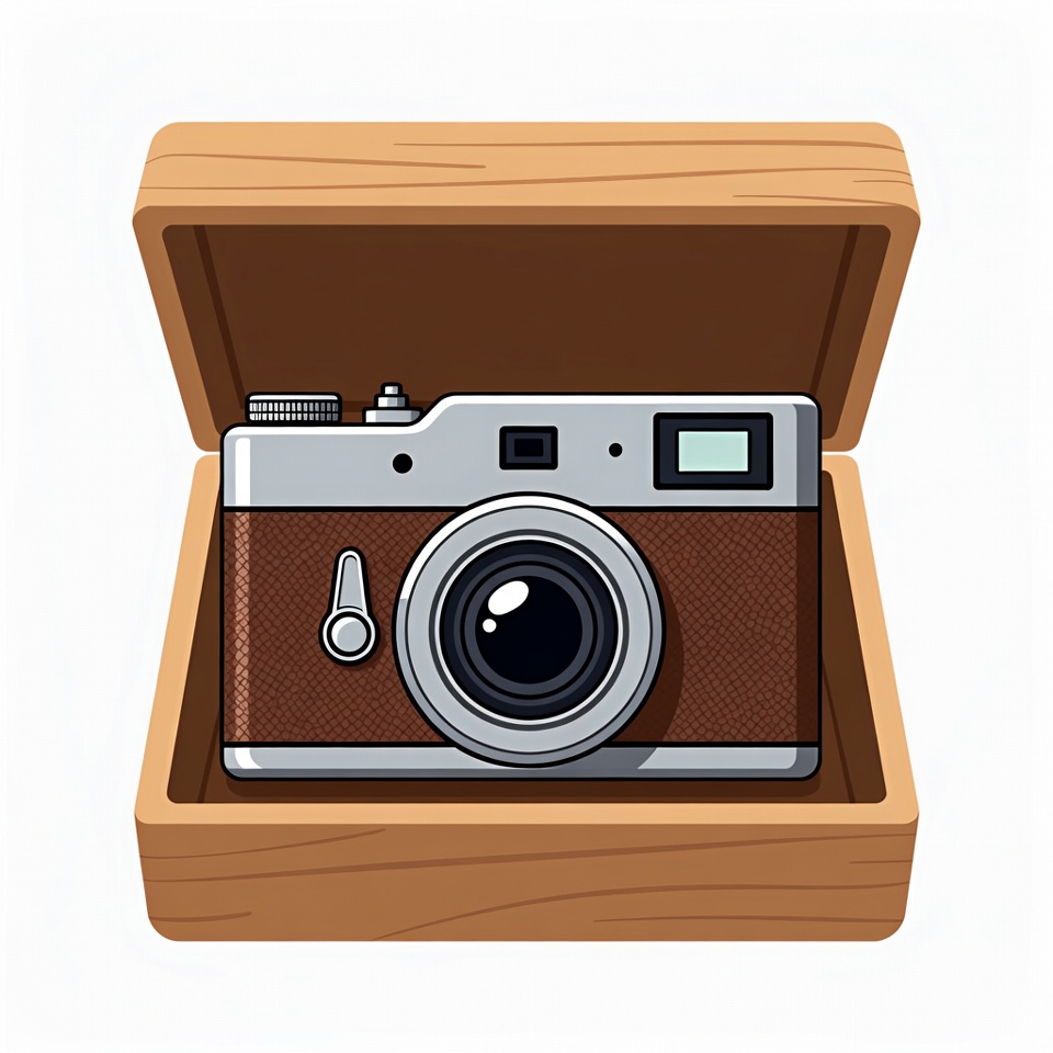 analog camera, camera, clipart, flat design, illustration, isolated background, leather camera, lens, open box, photography, retro camera, silver camera, vector art, wooden box, vintage camera