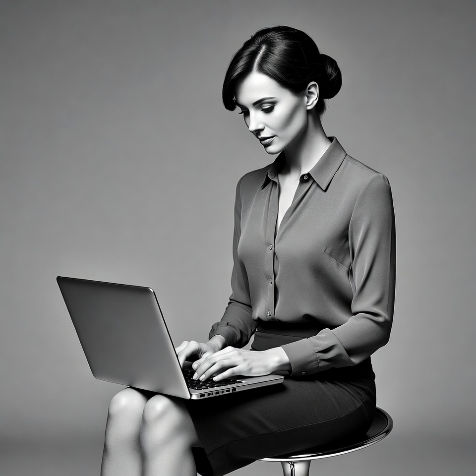 A woman with dark hair in a bun sits on a stool, typing on a laptop. She wears a collared gray blouse and pencil skirt. The image is in black and white against a plain gray background.