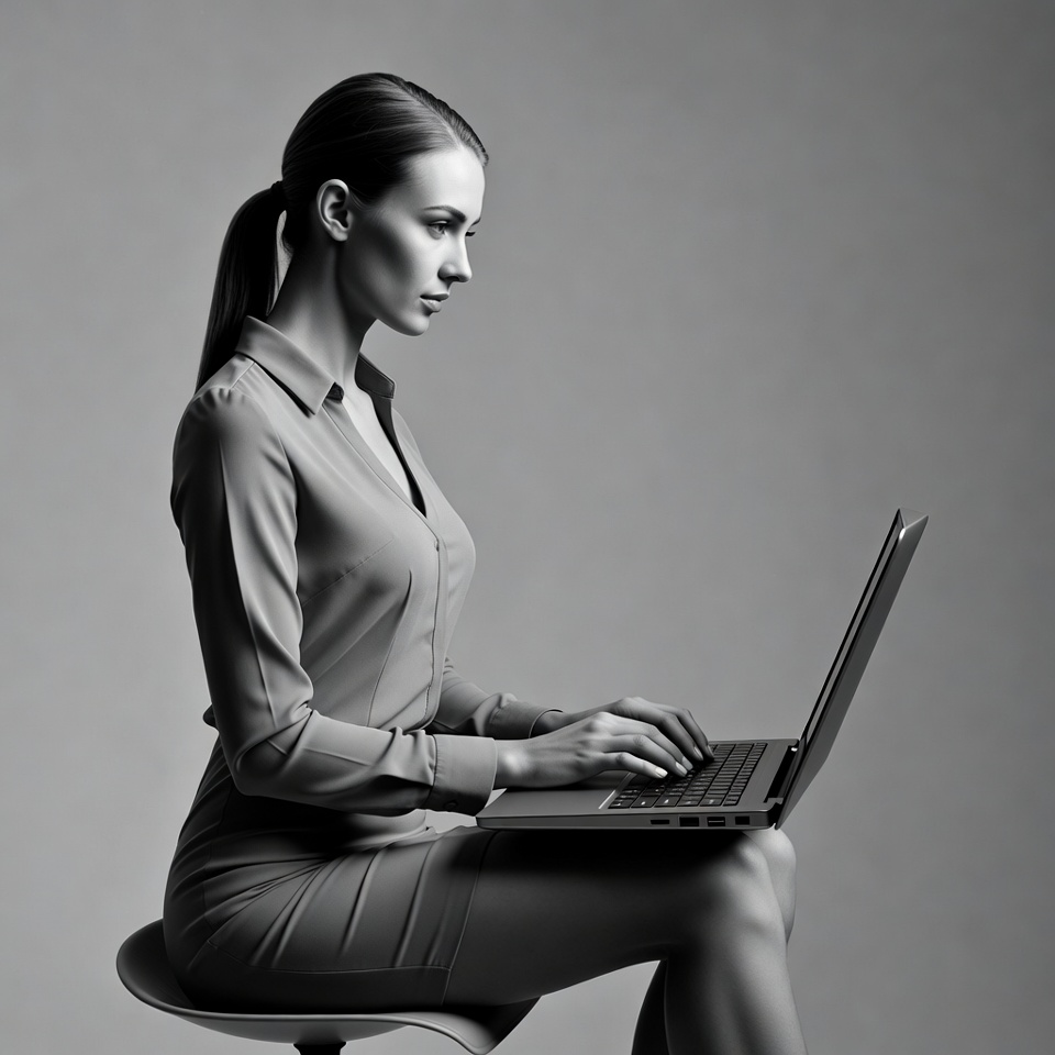 A woman with long hair in a ponytail sits on a stool, typing on a laptop. She wears a collared blouse and skirt in a black and white photo. She faces slightly to the side with a focused expression.