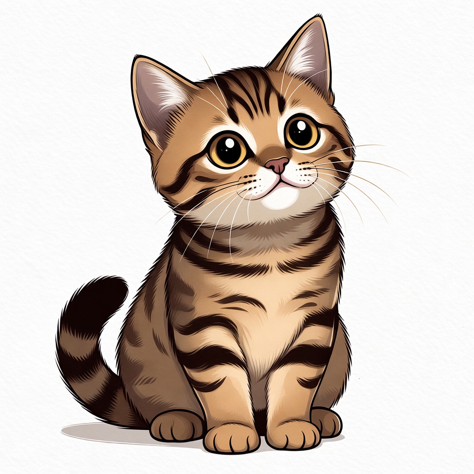 A cute cartoon tabby kitten with orange-brown fur and black stripes sits on a white background. The kitten has large expressive eyes, pink nose, and whiskers. Its tail curls around its body in an adorable pose.